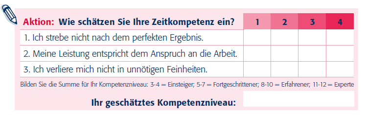 Menschen mit einem hohen Kompetenzniveau bei Einstellungen & Überzeugungen lassen sich nicht von ihren inneren Zeitdieben beeinflussen, also etwa Perfektionismus, Aufschieberitis, mangelnder Delegation oder fehlendem Nein-Sagen. Beziehen Sie sich hier beispielhaft auf Ihren Perfektionismus. Gehen Sie aber auch gerne einen Schritt weiter und denken Sie über andere innere Zeitdiebe nach: Was hindert Sie an einer optimalen Zeitnutzung?